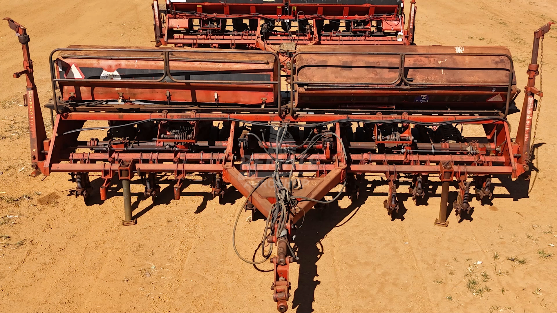 Plantadeira de sementes e adubo, com 13 linhas e espaçamento de 45 cm.