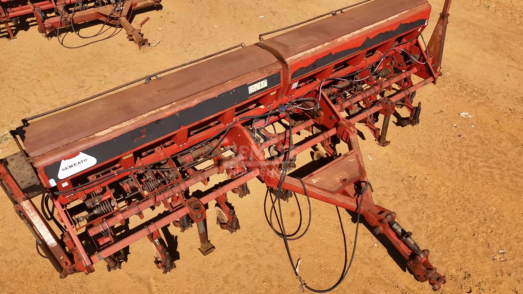 Plantadeira de sementes e adubo, com 13 linhas e espaçamento de 45 cm.