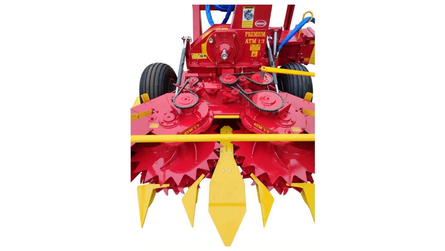 Colhedora ATM 1.7 com área de corte de 1,70 metros, possui sistema corte de base por facas com rotação