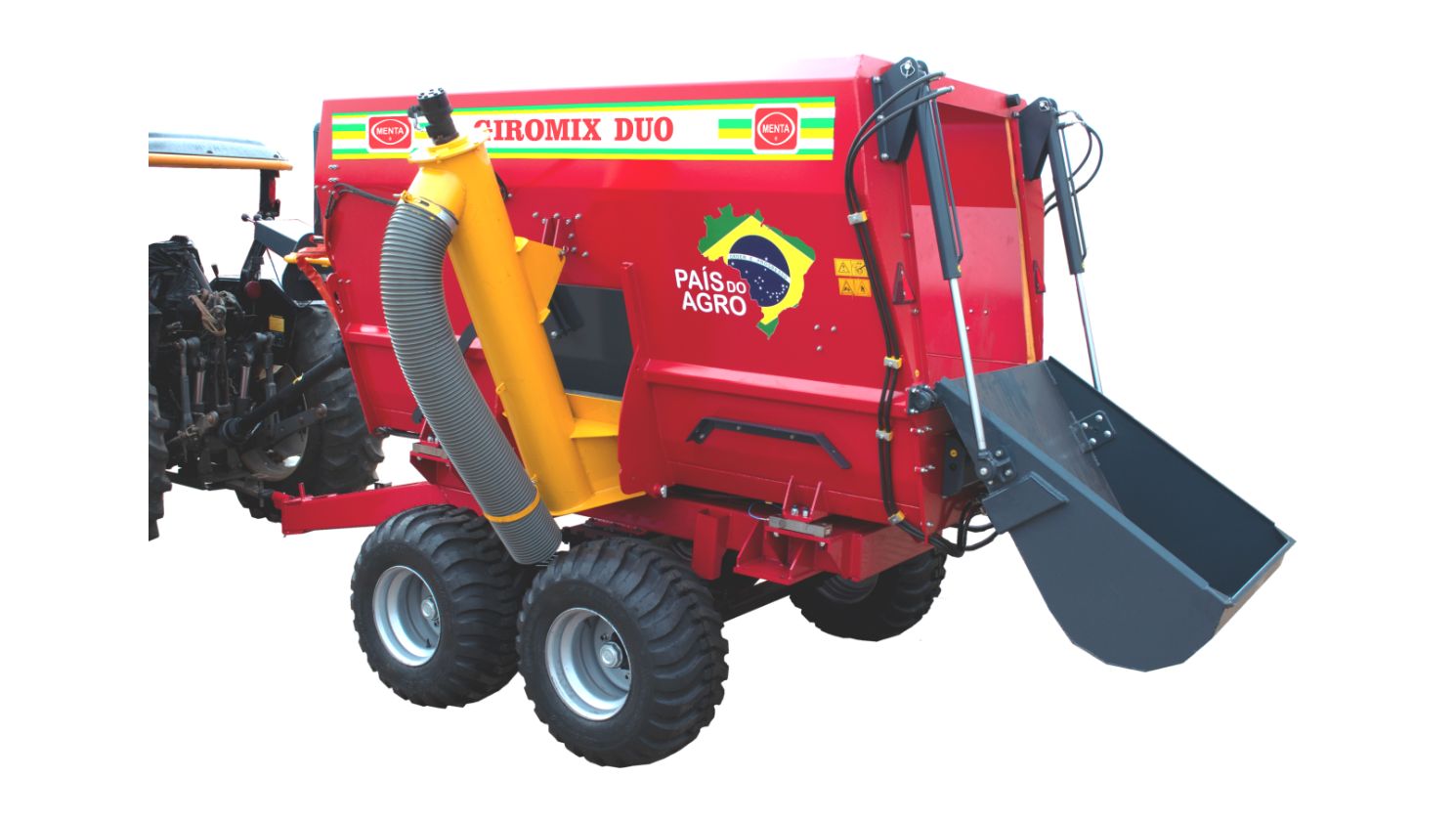 tomada de força do trator e com bomba hidráulica com reservatório independente, mistura homogênea com duas roscas sem fim cortadores e misturadores em aço de alta resistência com descarga lateral esquerda que descarrega diretamente ao cocho